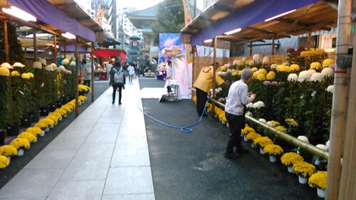 S図書館に向かっていると、途中にあるお寺で菊祭りをやっていた。いつもは通り過ぎるだけなのだけど、「菊祭り」となると見逃せない。 正面はミニ大仏さん?かな? 境内ではいろいろなイベントが行われている様子。 右端の画像は、背景図つきの箱庭。 お寺…